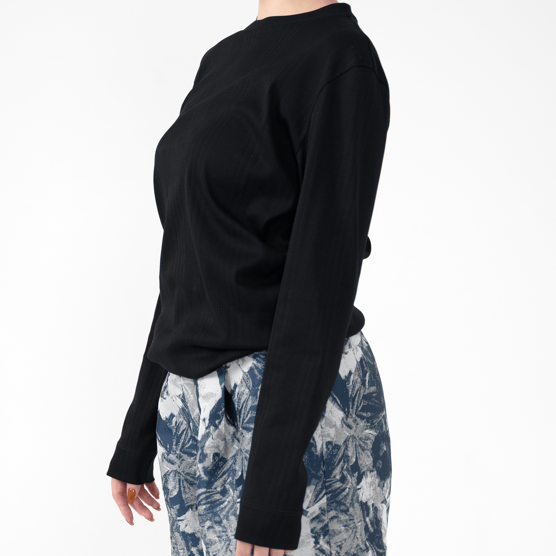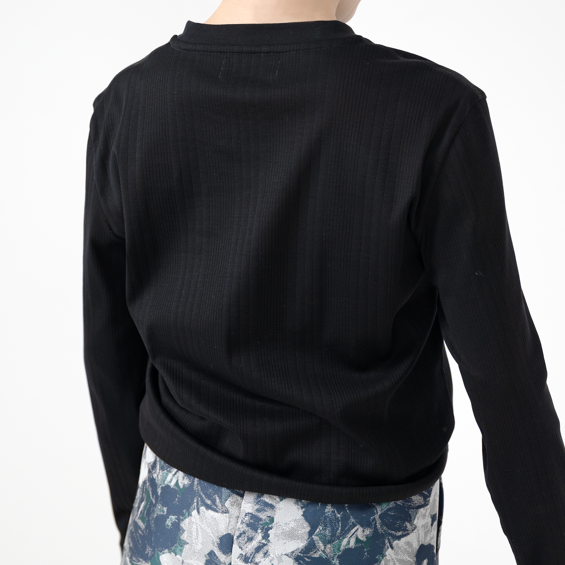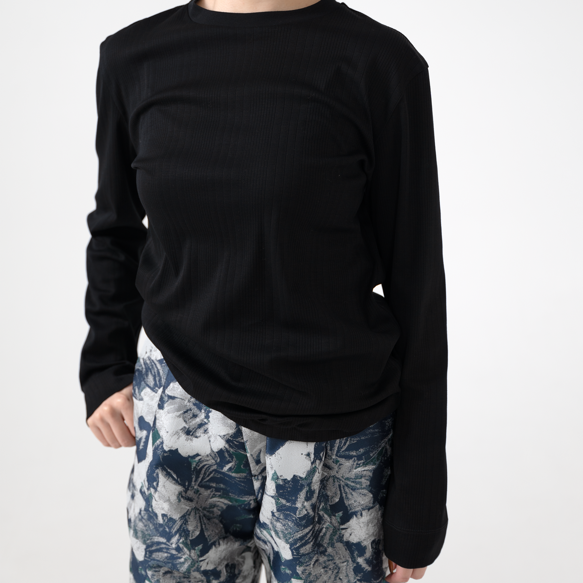 さらりとした肌触りと裾にゴムが入っているのが特徴で、シンプルなコーデに奥行きをプラスします。ピッタリしすぎない程よいフィット感と、丈を調節できる裾のゴムによって、デニムパンツやジャケットのインナーとしても活躍します。