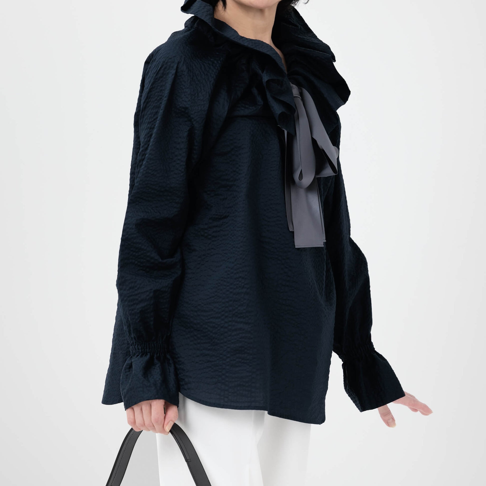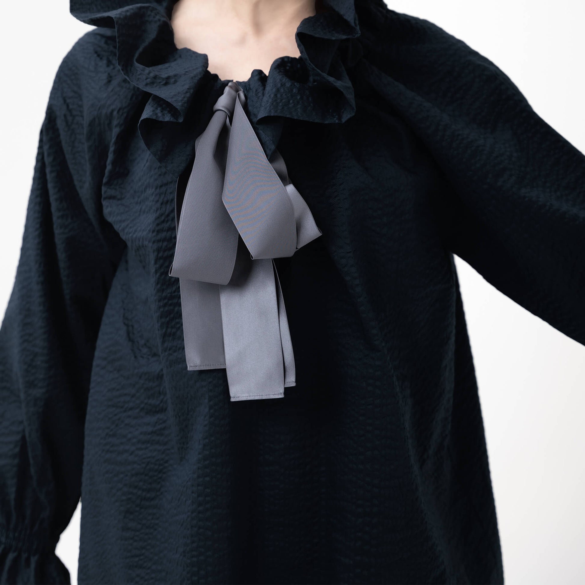 適度なハリ感と厚みを感じるミラクルウェーブ加工を施した素材を使用。ソフトな風合いと軽さが特徴で、襟元のリボンでお好みのフリル分量と襟の開きを調整して着用できます。袖口はゴムシャーリングでソフトな印象に。色味をシックに仕上げ、高級感のあるベロアリボンを使用することで甘くなりすぎないデザインに。スカートやパンツに合わせて、裾はインでもアウトでも着ることができる万能なアイテムです。